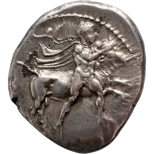 Obverse: the hero Thessalos, chlamys and petasos trailing behind him, wrestling bull right
