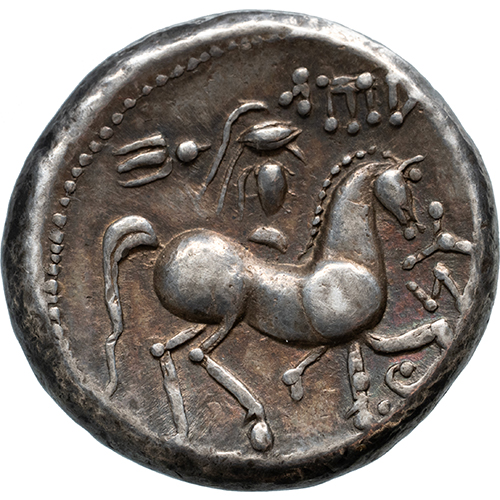 Reverse: stylised horseman surrounded by legend fragments, trident in left field, triskeles between front legs of horse