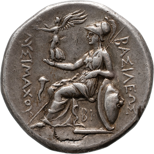 Reverse: BAΣIΛEΩΣ / ΛYΣIMAXOY, Athena Nikephoros seated left, left arm resting on shield, transverse spear in background