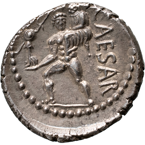 Reverse: CAESAR, Aeneas advancing left, holding palladium and carrying Anchises on his shoulder