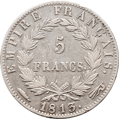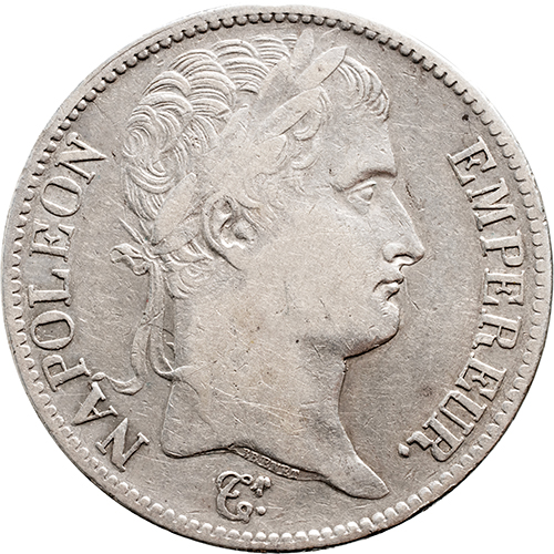 Voorzijde: borstbeeld van keizer Napoleon I naar rechts met lauwerkrans om het hoofd. Op de afsnede van de hals de naam van de graveur BRENET. Onder het borstbeeld Tr = Tiolier (naam van de modelleur)
