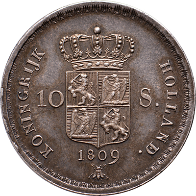 Keerzijde: KONINGRIJK – HOLLAND, gekroond wapenschild van het koninkrijk Holland tussen 10 – S, eronder jaartal en muntmeesterteken bij
