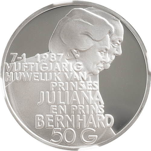 Keerzijde: 7-1 1987 / VIJFTIGJARIG / HUWELIJK VAN / PRINSES / JULIANA / EN PRINS / BERNHARD / 50 G, profiel van Juliana en Bernhard naar rechts