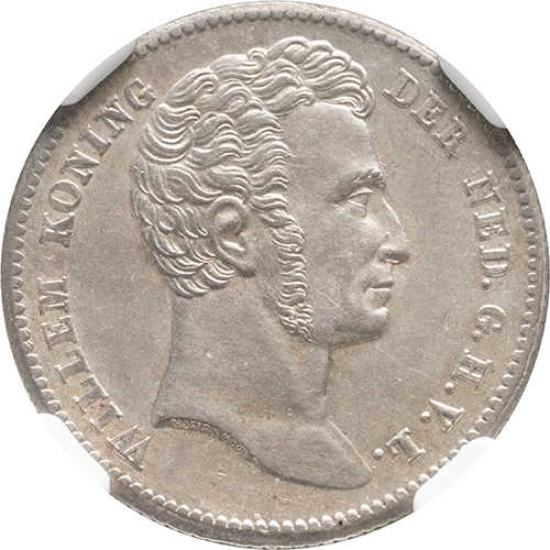 Voorzijde: borstbeeld van Willem I naar rechts, op halsafsnede VAN DE GOOR F.