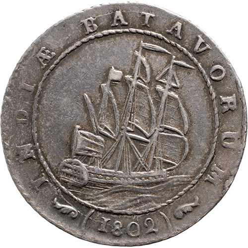 Voorzijde: INDIÆ BATAVORUM, driemaster binnen kabelcirkel, onderaan jaartal tussen haakjes en ornamenten aan weerszijden