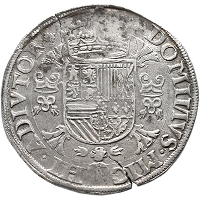 Keerzijde: DOMINVS . MIC – HI . ADIVTOR, gekroond Spaans-Oostenrijks-Bourgondisch wapen, geflankeerd door twee vuurstalen, geplaatst op een kruis van knoestige stokken en dragende het kleinood van de Orde van het Gulden Vlies