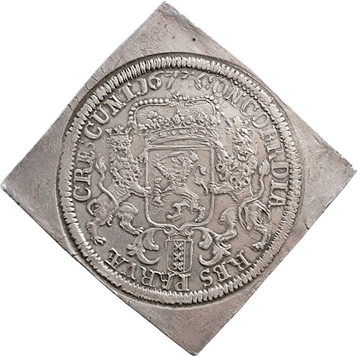 Keerzijde: CONCORDIA – RES PARVÆ – CRESCVNT – 1673, generaliteitswapen, waaronder stadswapentje in cartouche
