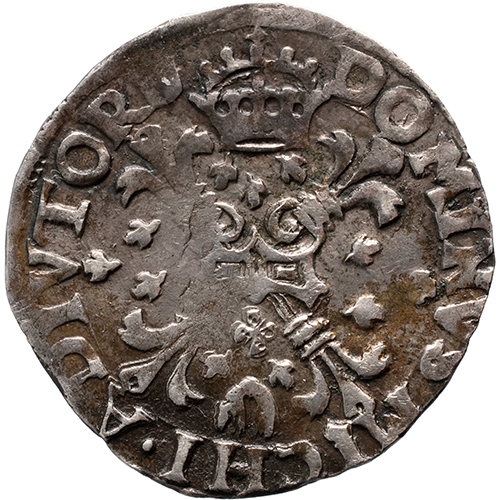 Keerzijde: DOMINVS – MIHCI. ADIVTOR, vuurstaal, geplaatst op een kruis van knoestige stokken en dragende het kleinood van de Orde van het Gulden Vlies