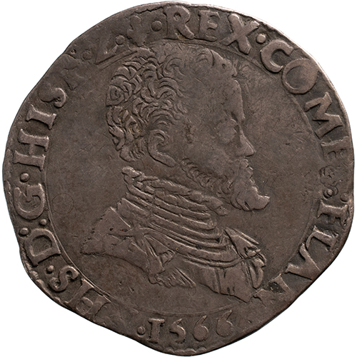 Voorzijde: PHS. D: G. HISP: Z. – .REX. COMES. FLAN. / 1566, borstbeeld naar rechts