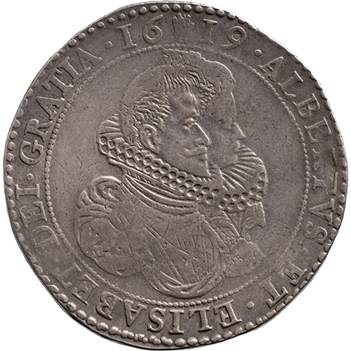 Voorzijde: ALBERTVS . ET . ELISABET . DEI . GRATIA . 16 (muntteken hand) 19, bustes van Albrecht en Isabella naar rechts