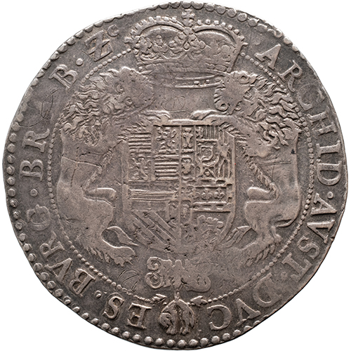 Keerzijde: . ARCHID . AVST . DVC – ES . BVRG . BRAB . Z- C ., gekroond wapen gehouden door twee leeuwen, eronder twee vuurstalen met het gulden vlies