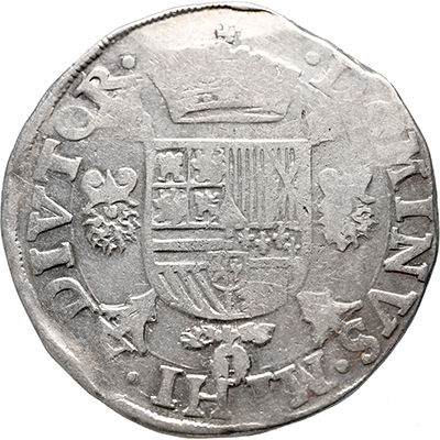 Keerzijde: DOMINVS . MIHI . ADIVTOR, gekroond Spaans-Oostenrijks-Bourgondisch wapen, geflankeerd door twee vuurstalen, geplaatst op een kruis van knoestige stokken en dragende het kleinood van de Orde van het Gulden Vlies