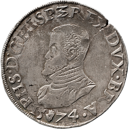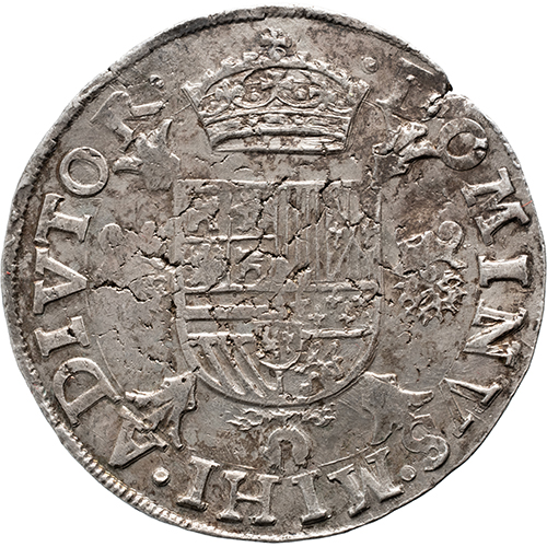 Keerzijde: DOMINVS . MIHI . ADIVTOR, gekroond Spaans-Oostenrijks-Bourgondisch wapen, geflankeerd door twee vuurstalen, geplaatst op een kruis van knoestige stokken en dragende het kleinood van de Orde van het Gulden Vlies