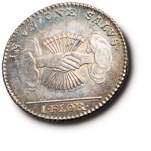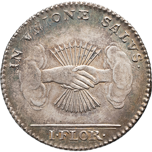 Keerzijde: IN VNIONE SALVS. / I . FLOR ., twee in elkaar grijpende handen met een bundel van 11 pijlen